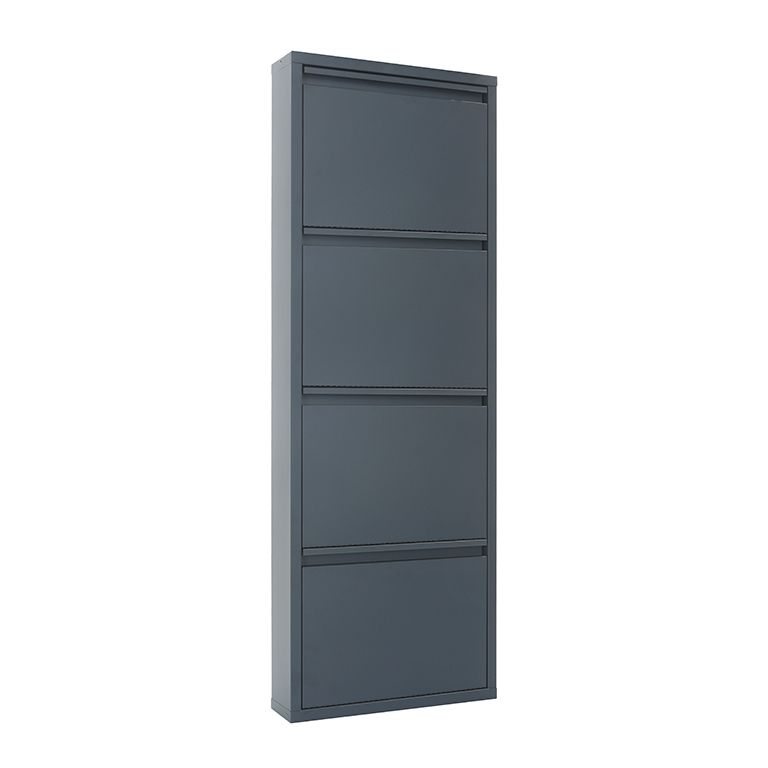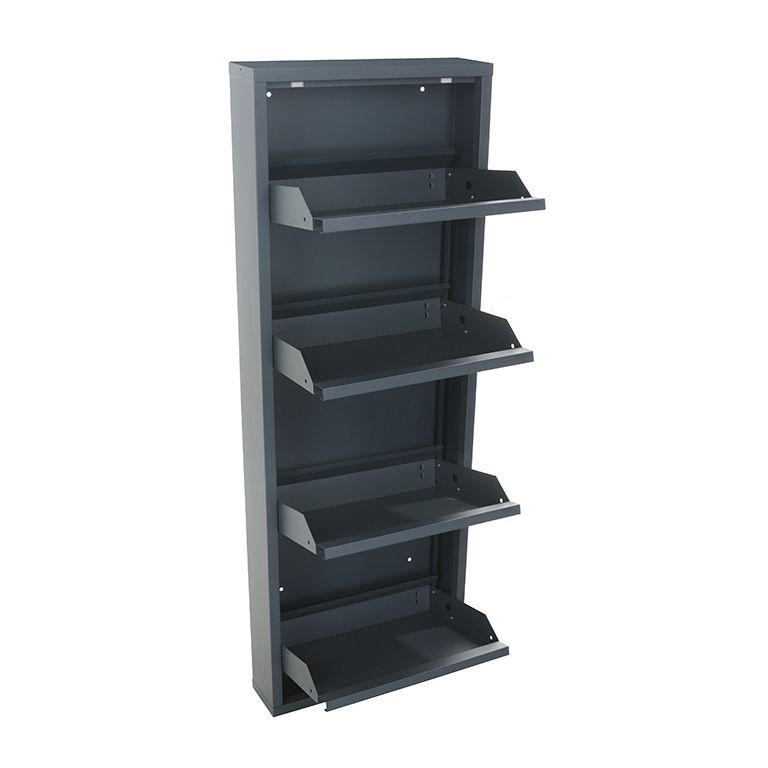 Четыре откидные секции работают синхронно — открываете одну, открываются все. Удобно, когда нужно быстро найти нужную пару среди восьми мест для обуви (размером до 43-го). Каждая полка рассчитана на две пары, что позволит разместить всю повседневную обувь в одном месте.
