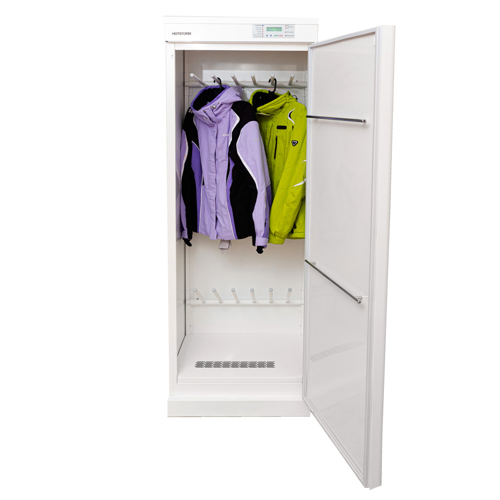 - Внутри корпуса установлены три регулируемые полки, которые могут поворачиваться и фиксироваться в вертикальном положении. На полки можно укладывать для сушки рукавицы, головные уборы или обувь. К полкам можно так же подвешивать плечики с одеждой. Шкаф закрывается одной дверью, которая имеет магнитный уплотнитель по периметру, ручку для открывания и на замок не закрывается.